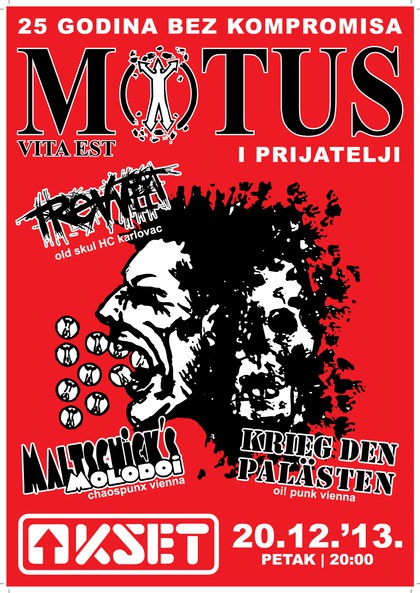 Podršku slavljenicima dati će 3 žestoka benda. Iz Beča nam dolaze Krieg den Palästen, rođeni iz pepela benda Wien's No.1 u rujnu 2013. godine. Svoju glazbu nazivaju „psiho-pogo-pop“, a svoj prvi koncert održati će upravo na obljetnici 25 godina Motusa. Uz KdP pridružit će nam se i 2 domaća benda. Karlovački Treaviit su nastali u proljeće 2010. kao projekt za ispucavanje viška kreativnosti i stvaranja kvalitetne buke od strane iskusnih članova nekoliko hardcore punk sastava (Motus, Carl Hunter, Kontra, N.S.I.B, Flaster of Disaster, Naelc Wonk). Od početka su u istoj postavi koja svira „old school HC“. A u Zagreb po prvi puta dolaze i Borovski Štakori, vukovarski bend koji je ove godine izdao 2. album "Romantika i Drama" na kojem prevladava punk zvuk, sa primjesama funka, reggae-a i rocka.