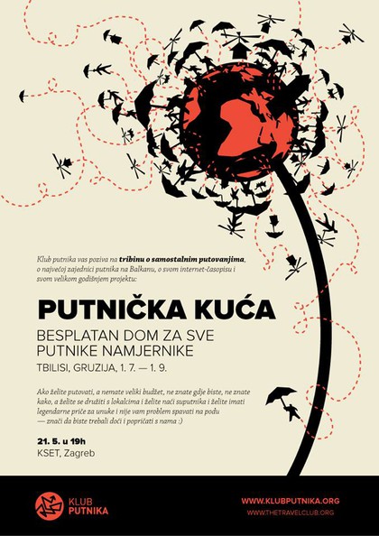 Tribina o putovanjima? Hm, čini se da će se pričati o putovanjima. Naš Klub putnika će vam reći koju korisnu o putovanjima, o sebi i o našem projektu Putnička kuća. Klub putnika se bavi promicanjem kulture putovanja: geografska poetika i polemika. Svake godine organizira se Putnička kuća – preko interneta se prikupe donacije, unajmi se kuća na određenoj i kroz nju prođu svi putnici namjernici besplatno. Ovogodišnja Putnička kuća je u Tbilisiju. (Gruzija! Nešto novo, nešto divlje!) Dođite i saznajte detalje! Ova tribina nije za svakoga, ali ćemo reći za koga jest.