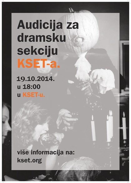 Ovim oglasom traže se u pučanstvu svi gospari i svi paževi, sve vile i svi trolovi, sve princeze i sve žabe, svi redatelji i svi scenografi jer Dramska sekcija KSET-a širom otvara vrata za sve nove i nadobudne nade. Naša družina ponosno se predstavlja u nedjelju 19. listopada u kotlovnici u Unskoj 3. Ne brini, ne moraš prolaziti kroz nikakve podrume, dođi u KSET i prevari nas na način da pomislimo da nešto i znaš.