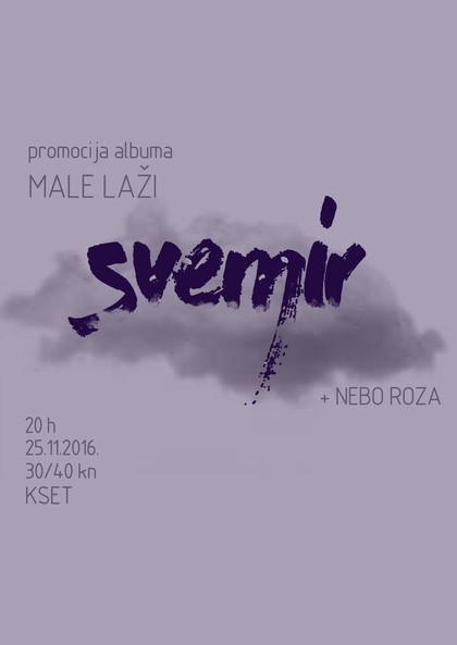 Zagrebački bend Svemir održat će koncertnu promociju albuma ''Male laži'' u KSET-u u petak 25. studenog 2016. Svemir je indie pop bend predvođen Zvonkom Obajdin koji na zagrebačkoj sceni, a u posljednje vrijeme sve češće i izvan nje, djeluje posljednjih pet godina. Krajem svibnja objavili su svoj treći studijski album ''Male laži'', samizdat.