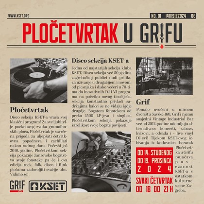 Počevši još 2016., Pločetvrtak pokazuje šarolikost KSET-ove fonoteke koju gradi već 50 godina i koja broji preko 1500 LP-jeva i singlica. Tijekom 6 tjedana boravka Disco sekcije u Grifu, imat ćeš priliku iskusiti tu raznovrsnost KSET-ove fonoteke: čekaju te rock, folk, disco, funk i svašta nešto između, a na tebi je samo da dođeš, udobno se smjestiš i slušaš, a usput si naručiš koje pivo iz bogate Grifove ponude.