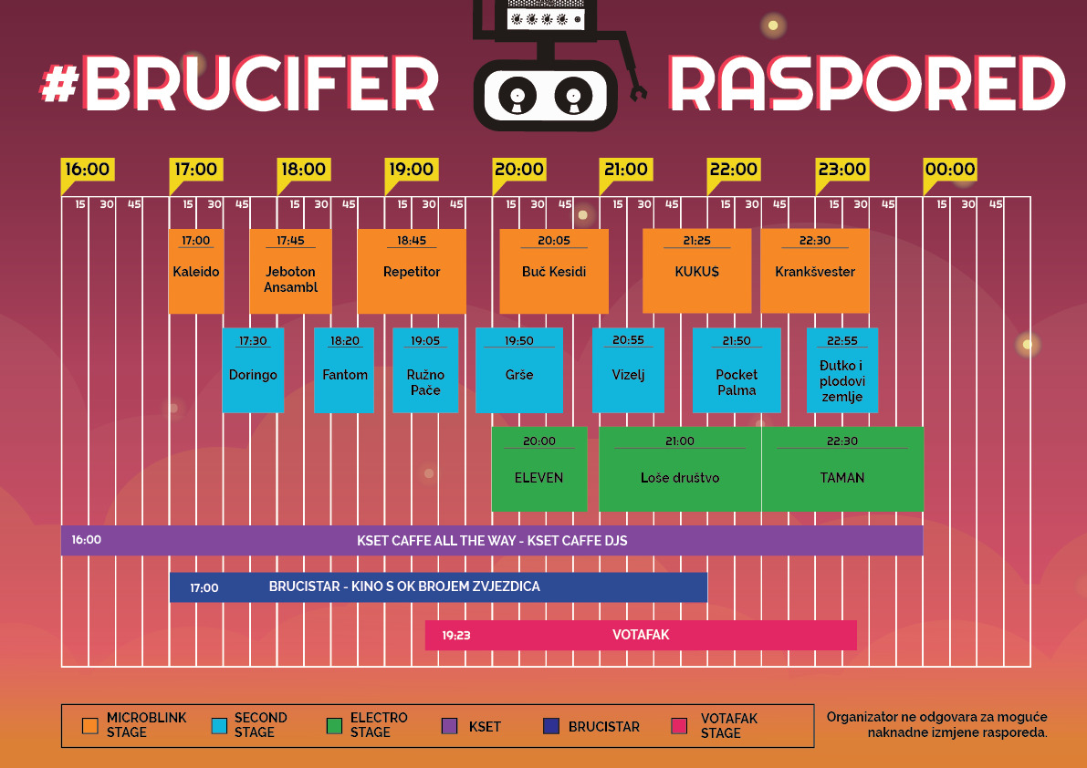 Za dobru zabavu na ovogodišnjoj Brucošijadi FER-a zaduženi su Krankšvester, Buč Kesidi, KUKU$, Repetitor, Pocket Palma, Grše, Jeboton Ansambl, Ružno Pače, Fantom, Đutko i Plodovi Zemlje, Vizelj, Doringo, TAMAN, Loše Društvo, ELEVEN i Kaleido.